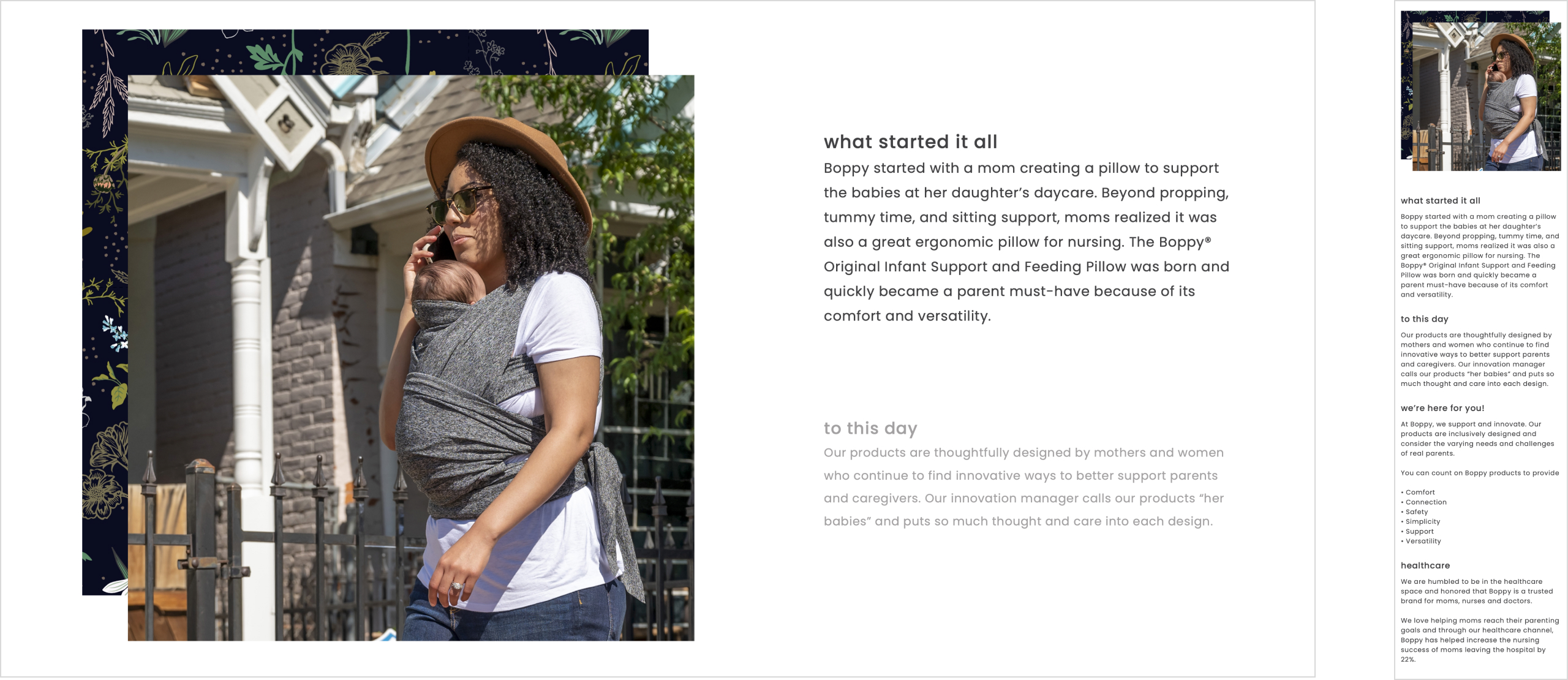 The home page was designed and developed with an emphasis on Boppy's values and identity. The home page heavily showcases their products and missions statements to do so.
