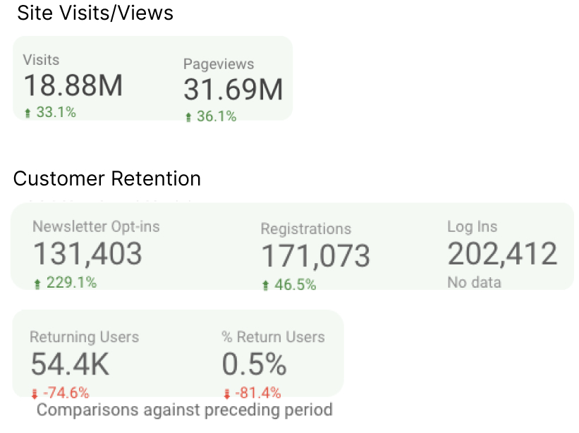 Every quarter, Customer Retention is an important KPI target for the online magazine. Despite an increase in Customer Vsits and Registration (user conversion), there was a decrease in Returning Users in the past year.