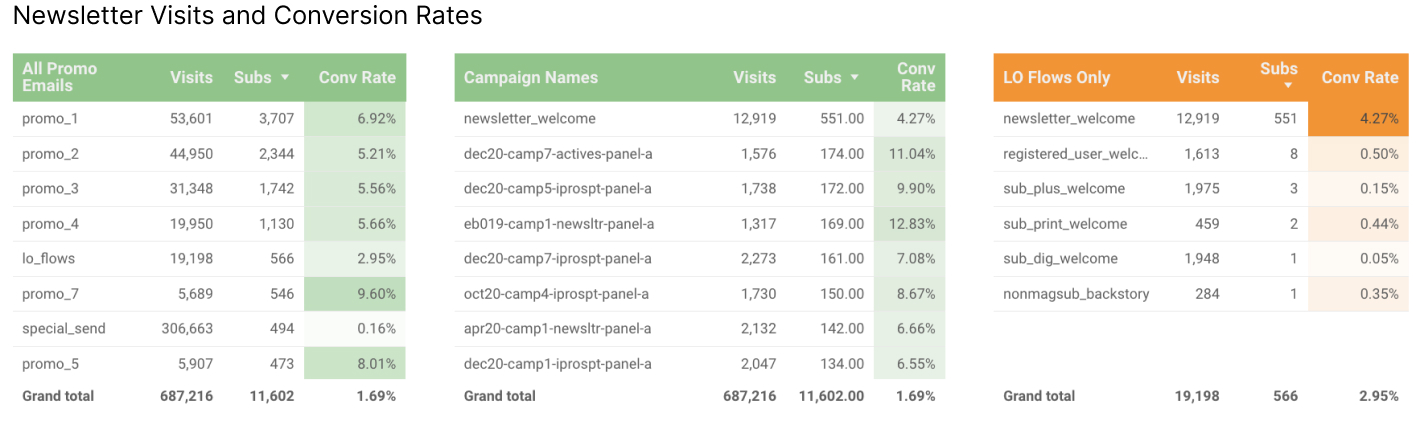 From the newsletters themselves, user appear to visit the site again after they've received their first welcome email from signing up for the first time. Promotional emails return an even higher rate of conversion than that of newly registered users.