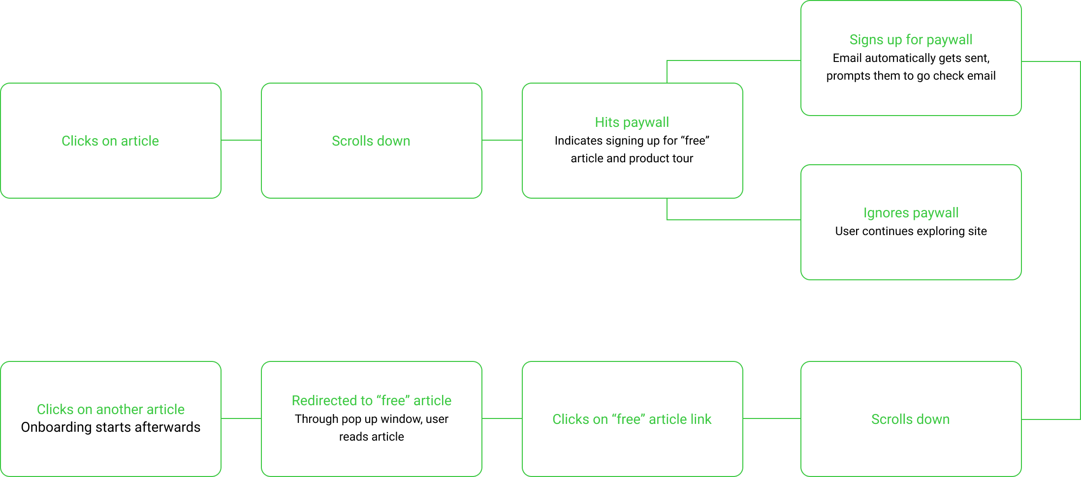 Foreign Affairs currently has a paywall user flow. A non-subscriber is able to get a free article a day. After they encounter a paywall for an article and sign up, they will be emailed a link to that free article. This link initiates an product tour, which follows the same flow as the onboarding process. When a non-subscriber reaches the end of the process, they will be brought to a newsletter sign up form.