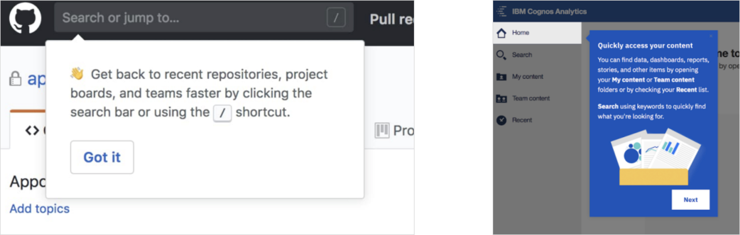 For a few days after a user has created an account, Github will have tooltips that appear periodically. These tooltips offer hints that not only inform users of their features, but also promote the use of their product.